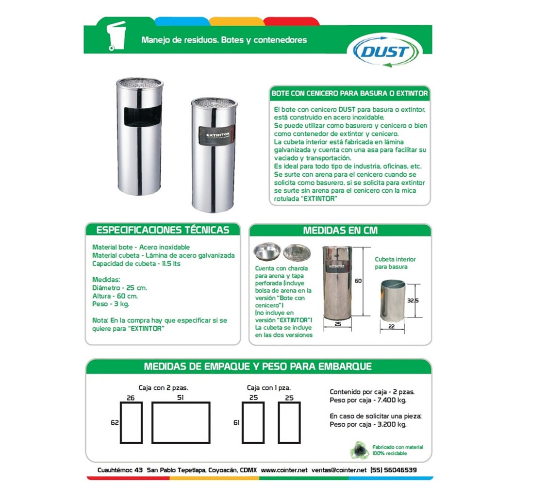 El bote extintor en acero inoxidable destaca por su durabilidad sobresaliente, ya que soporta uso continuo, cambios de clima y exposición en áreas de alto tránsito sin deteriorarse. Su diseño elegante y moderno mejora la imagen del espacio, manteniendo el extintor visible pero protegido. También facilita la organización de áreas de seguridad, promoviendo el cumplimiento de reglamentos y aumentando la vida útil del equipo. Es una inversión clave para empresas y negocios que buscan funcionalidad, resistencia y un estilo profesional en sus instalaciones.